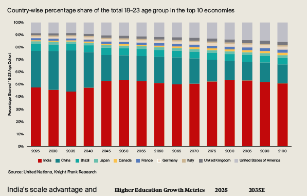 ● India hosts the world’s largest higher-education-age population at 155 million, projected to reach 165 million by 2030.